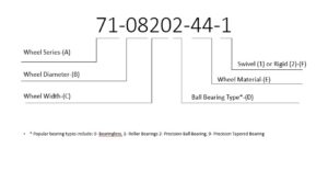 Wheel Series Numbers: 71-08202-44-1. These first two numbers are the wheel series. This can range from our 30 series to some of our larger capacities such as our 99 series. The main variations you will find between series are top plate sizes, swivel sections, and most importantly weight capacity.
