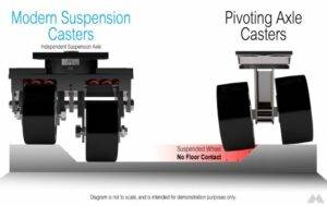 Here at Caster Concepts, we offer several shock-absorbing casters, including Modern Suspension Systems casters, which offer independent suspension shock-absorbing casters in steel or aluminum casters.
