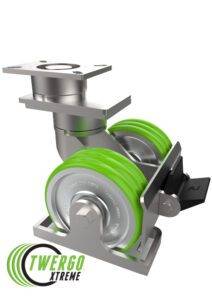 TWERGO Xtreme Casters with a Swivel-on-Swivel design enable cart operators to move heavier loads with less effort. The dual swivels allow for increased freedom of movement, allowing a cart operator to get momentum going before the wheel has to move. This lowers the push force to get the cart moving, adding even more ergonomic benefits combined with the TWERGO wheel.