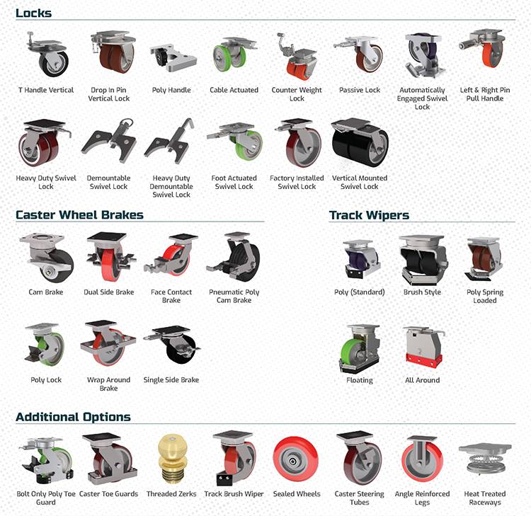 For heavy duty applications, our caster wheel brakes include single and dual side brakes, face contact brakes, wraparound, and poly lock and poly cam brakes for increased safety and stopping power.