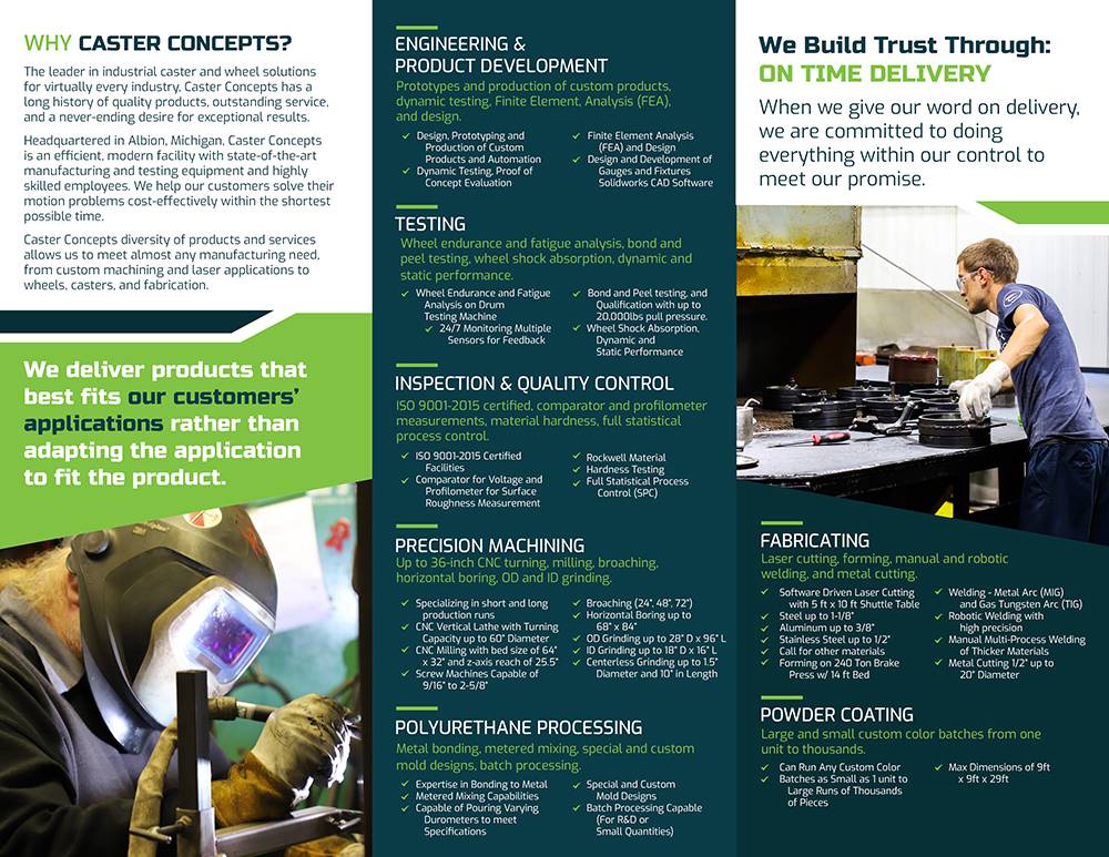 Using the most modern manufacturing machinery and lean manufacturing principles, Caster Concepts offers our customers exactly the product they want at a price comparable to a mass-produced price. Our product line is distinguished by its highest quality and supply chain dependability, featuring both USA-made casters and wheels. Using laser cutting and press brakes as opposed to stampings and iron workers, along with a make-to-order philosophy, we deliver products that best fit our customers’ applications rather than adapting the application to fit the product.